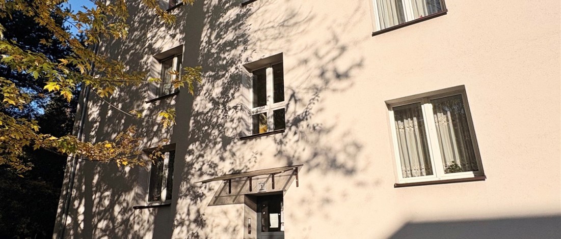 Budynek po termomodernizacji, z czystą klatką schodową i zadbanym otoczeniem. Wokół dużo zieleni i miejsc parkingowych.
